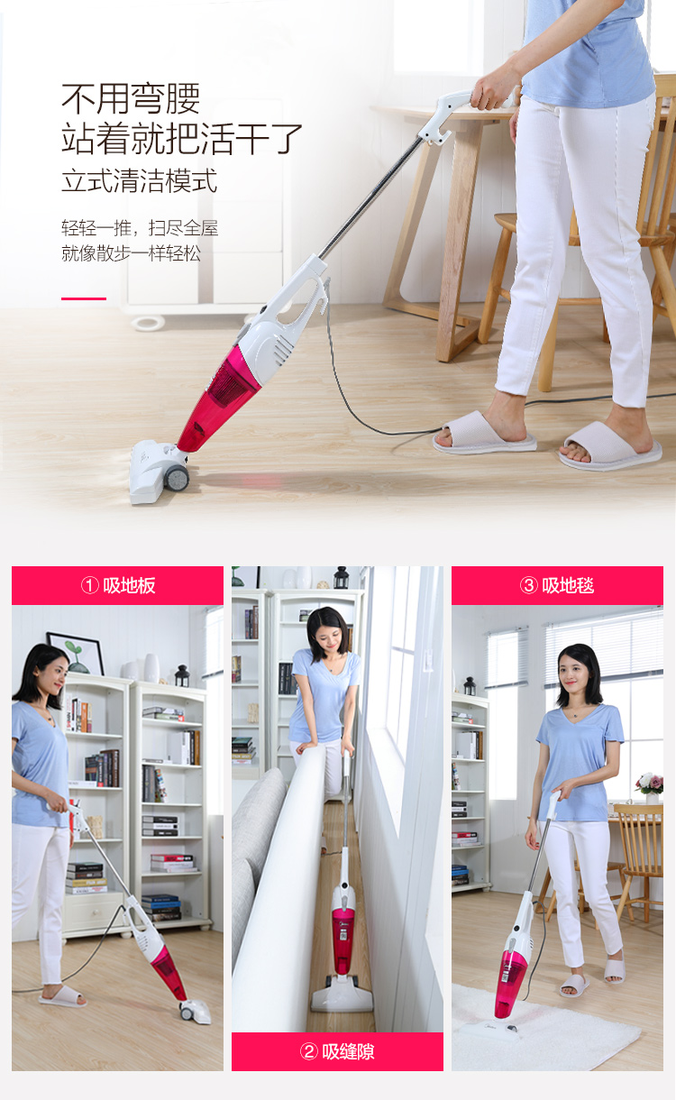 | 包装清单 | 吸尘器 * 1、手柄组件*1、地刷组件*1、长扁吸*1、转接头*1、床单刷*1、说明书(含保修卡)*1 |