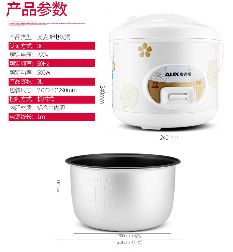 | 商品名称 | 奥克斯(AUX) CFXB30-10 3L 迷你 学生 电饭煲 电饭锅 带蒸笼 |
