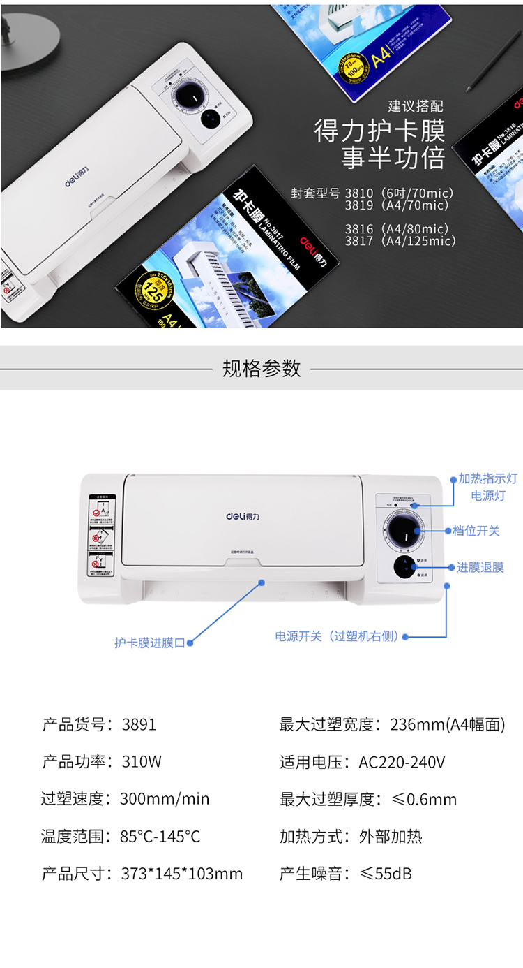 得力(deli)3891 适用A4静音设计时尚简洁塑封机/过塑机 双向电机 灰色