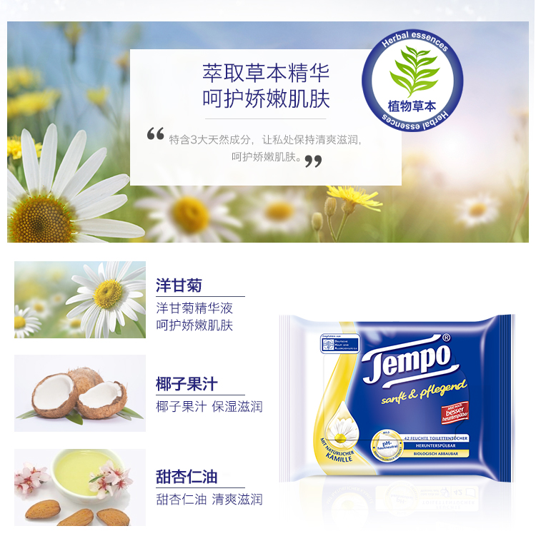 得宝Tempo/洋甘菊卫生湿巾湿湿巾厕纸洁阴私处清洁42片