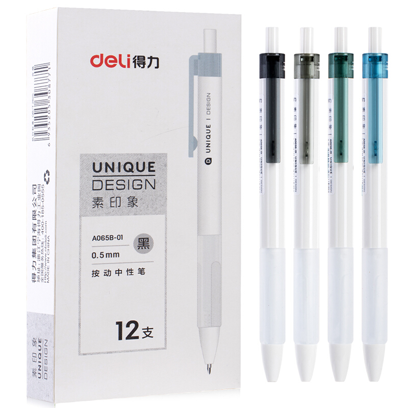 得力(deli)素印象0.5mm按动黑色中性笔 子弹头水性签字笔 12支/盒A065B-01