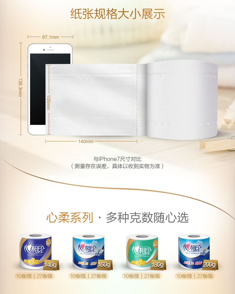 心相印卫生纸 心柔系列 3层160g卷纸*10粒